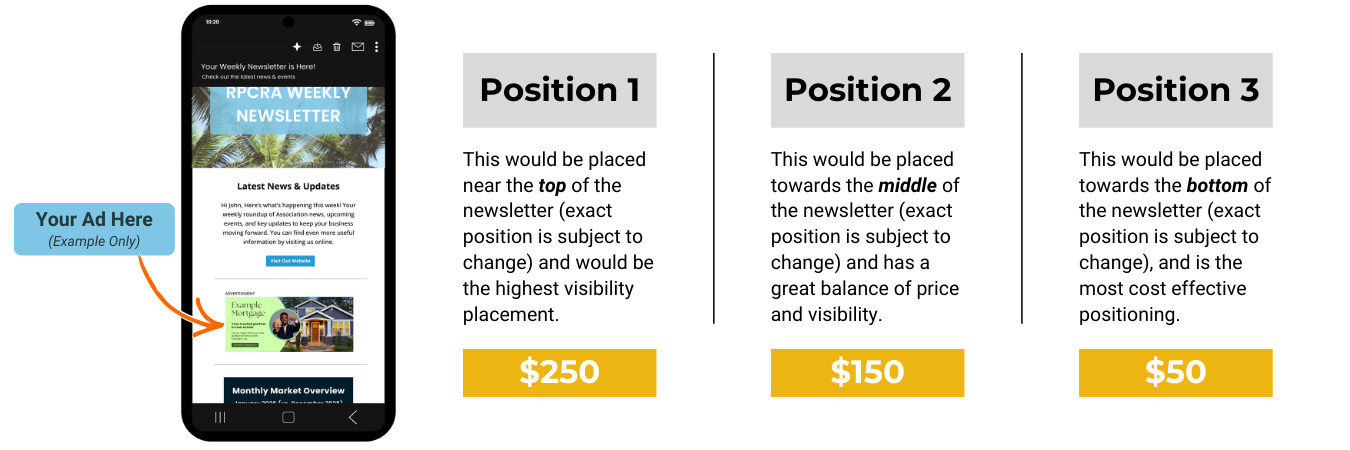 Ad placement in email newsletters directly impacts how often your message is seen and engaged with. Ads positioned near the top or within high-interest sections receive greater visibility and higher click-through rates, and ensures your brand aligns naturally with relevant content. Strategic placement maximizes exposure, strengthens brand recognition, and improves overall advertising effectiveness. Up to three ad spaces are available each week in both the Member Weekly E-News and the Professional Growth Weekly newsletters.